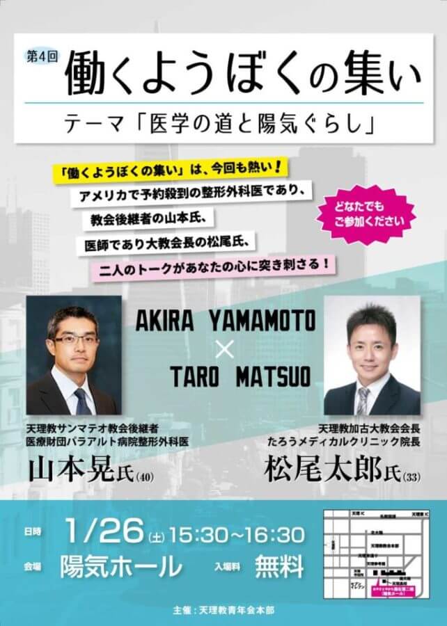 第4回 働くようぼくの集い働くようぼくの集い (第4回 in陽気ホール) 〜医学の道と陽気ぐらし〜 <日時> 2019.1.26(15:30〜16:30)<場所> 天理教おやさとやかた南右第二棟 陽気ホール<その他> ★入場無料★ 駐車場は南右第二棟前の駐車場をご利用ください。 〜〜〜〜〜 講師は、天理教サンマテオ教会後継者であり、アメリカで予約殺到の外科医である山本晃 氏と、 天理教加古大教会長であり、医師でもある松尾太郎 氏。ぜひ奮ってお越しください。