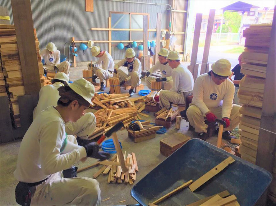 おやさとやかたのふしんはもちろんのこと、行事の準備や撤収など、おぢば周辺の様々な作業に携わっています。ひのきしん隊の正式名称は「おやさとふしん青年会ひのきしん隊」。
